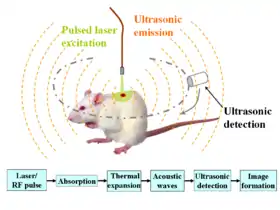 Photoacoustic imaging or optoacoustic imaging is a biomedical imaging modality based on the photoacoustic effect. Non-ionizing laser pulses are delivered into biological tissues and part of the energy will be absorbed and converted into heat, leading to transient thermoelastic expansion and thus wideband (i.e. MHz) ultrasonic emission. The generated ultrasonic waves are detected by ultrasonic transducers and then analyzed to produce images. It is known that optical absorption is closely associated with physiological properties, such as hemoglobin concentration and oxygen saturation.[1] As a result, the magnitude of the ultrasonic emission (i.e. photoacoustic signal), which is proportional to the local energy deposition, reveals physiologically specific optical absorption contrast. 2D or 3D images of the targeted areas can then be formed.[2]