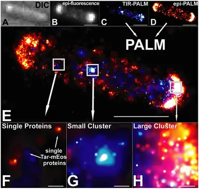 Photo-activated localization microscopy (PALM or FPALM)[1][2] and stochastic optical reconstruction microscopy (STORM)[3] are widefield (as opposed to point scanning techniques such as laser scanning confocal microscopy) fluorescence microscopy imaging methods that allow obtaining images with a resolution beyond the diffraction limit. The methods were proposed in 2006 in the wake of a general emergence of optical super-resolution microscopy methods, and were featured as Methods of the Year for 2008 by the Nature Methods journal.[4] The development of PALM as a targeted biophysical imaging method was largely prompted by the discovery of new species and the engineering of mutants of fluorescent proteins displaying a controllable photochromism, such as photo-activatible GFP. However, the concomitant development of STORM, sharing the same fundamental principle, originally made use of paired cyanine dyes. One molecule of the pair (called activator), when excited near its absorption maximum, serves to reactivate the other molecule (called reporter) to the fluorescent state.