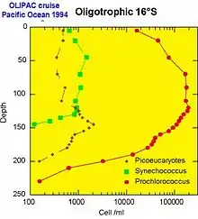 • Cyanobacteria belonging to the genus Prochlorococcus are particularly remarkable. With a typical size of 0.6 µm, Prochlorococcus was discovered only in 1988[7] by two American researchers, Sallie W. (Penny) Chisholm (Massachusetts Institute of Technology) and R.J. Olson (Woods Hole Oceanographic Institution). In spite of its small size, this photosynthetic organism is undoubtedly the most abundant of the planet: indeed its density can reach up to 100 million cells per liter and it can be found down to a depth of 150 m in all the intertropical belt.[17]