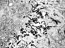 The best known species of Lagenidium is Lagenidium giganteum, a parasite of mosquito larvae used in biological control of mosquitoes. Two different species cause disease exclusively in dogs: L. caninum and L. karlingii. Lagenidiosis is found in the southeastern United States in lakes and ponds. It causes progressive skin and subcutaneous lesions in the legs, groin, trunk, and near the tail. The lesions are firm nodules or ulcerated regions with draining tracts. Regional lymph nodes are usually swollen. Spread of the disease to distant lymph nodes, large blood vessels, and the lungs may occur.[6] An aneurysm of a great vessel can rupture and cause sudden death.[4] L. caninum is the more aggressive species and is more likely to spread to other organs than L. karlingii.[10]