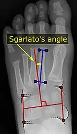 Pigeon toe can be diagnosed by physical examination alone.[6] This can classify the deformity into "flexible", when the foot can be straightened by hand, or otherwise "nonflexible".[6] Still, X-rays are often done in the case of nonflexible pigeon toe.[6] On X-ray, the severity of the condition can be measured with a "metatarsus adductus angle", which is the angle between the directions of the metatarsal bones, as compared to the lesser tarsus (the cuneiforms, the cuboid and the navicular bone).[7] Many variants of this measurement exist, but Sgarlato's angle has been found to at least have favorable correlation with other measurements.[8] Sgarlato's angle is defined as the angle between:[5][9]
