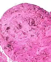 Micrograph of diffuse TGCT showing pigmented hemosiderin-laden macrophages (brown/red). H&E stain.