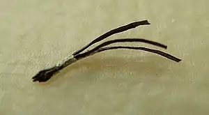 | An extracted pili multigemini with three distinct hairs growing from the same source. | |