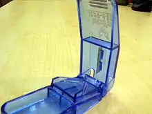 A pill-splitter is a simple and inexpensive device to split medicinal pills or tablets, comprising some means of holding the tablet in place, a blade, and usually a compartment in which to store the unused part. The tablet is positioned, and the blade pressed down to split it. With care it is often possible to cut a tablet into quarters. Also available as consumer items are multiple pill splitters, which cut numerous round or oblong pills in one operation.