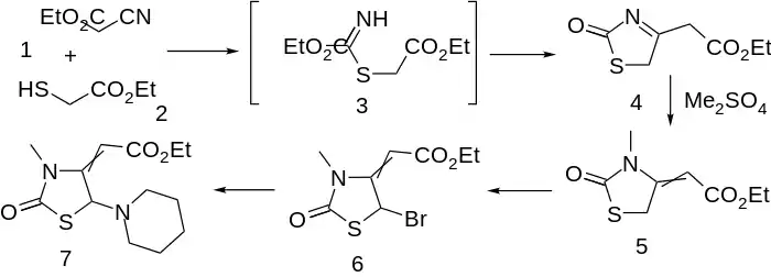 Condensation of ethyl mercaptoacetate with ethyl cyanoacetate leads to thiazolinone (4); an intermediate such as 3, involving addition of the mercaptide to the nitrile function can reasonably be invoked. M/ethylation with di(m)ethyl sulfate proceeds on nitrogen with the comcomitant shift of the enamine to afford olefin (5). Bromination of the active methylene (6) followed by displacement of halogen by piperidine affords the choleretic piprozolin (7).