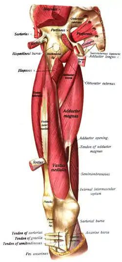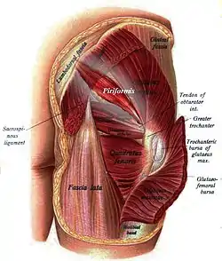 It exits the pelvis through the greater sciatic foramen.[2] It then inserts onto the greater trochanter of the femur.[1] Its tendon often joins with the tendons of the superior gemellus, inferior gemellus, and obturator internus muscles prior to insertion.