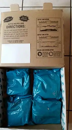 This box of additives is meant for septic tanks. It instructs users to add one of the blue packets of powdered material each month.