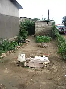A pit latrine generally consists of three major parts: a hole in the ground, a concrete slab or floor with a small hole, and a shelter.[7] The shelter is also called an outhouse.[10] The pit is typically at least three meters (10 feet) deep and one meter (3.2 feet) across.[7] The hole in the slab should not be larger than 25 centimeters (9.8 inches) to prevent children falling in.[4] Light should be prevented from entering the pit to reduce access by flies.[4] This may require the use of a lid to cover the hole in the floor when not in use.[4] The World Health Organization recommends the pits are built a reasonable distance from the house, balancing issues of easy access versus that of smell.[4] The distance from water wells and surface water should be at least 10 meters (32 feet) to decrease the risk of groundwater pollution.[11] When the pit fills to within 0.5 meters (1.6 feet) of the top, it should be either emptied or a new pit constructed and the shelter moved or re-built at the new location.[12] Fecal sludge management involves emptying pits as well as transporting, treating and using the collected fecal sludge.[3] If this is not carried out properly, water pollution and public health risks can occur.[3]