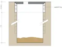 The pits should be of an adequate size to accommodate a volume of waste generated over one or two years. This allows the contents of the full pit enough time to transform into a partially sanitized, soil-like material that can be manually excavated. It is recommended that the twin pits be constructed 1 m apart from each other to minimize cross-contamination between the maturing pit and the one in use. It is also recommended that the pits be constructed over 1 m from any structural foundation as leachate can negatively impact structural supports. Water within the pit can impact its stability. Therefore, the full depth of the pit walls should be lined to prevent collapse and the top 30 cm should be fully mortared to prevent direct infiltration and to support the superstructure.[29]