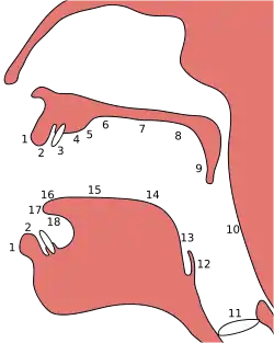 1. Exo-labial, 2. Endo-labial, 3. Dental, 4. Alveolar, 5. Post-alveolar, 6. Pre-palatal, 7. Palatal, 8. Velar, 9. Uvular, 10. Pharyngeal, 11. Glottal, 12. Epiglottal, 13. Radical, 14. Postero-dorsal, 15. Antero-dorsal, 16. Laminal, 17. Apical, 18. Sub-apical