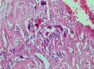 | Photomicrograph showing proliferating intermediate trophoblast with scarce cytotophoblastic and syncytiotrophoblastic elements | |