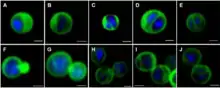 Confocal laser scanning micrographs of Gemmata obscuriglobus budding cells stained with DAPI and DiOC6 .