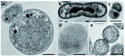Transmission electron micrographs of dividing cells displaying different cell division modes in the PVC superphylum. (a) Gemmata obscuriglobus (b) Chthoniobacter flavus (c) Lentisphaera araneosa (d) Phycisphaera mikurensis and (e) Chlamydia trachomatis. Scale bars, 0.5 μm.[20]