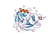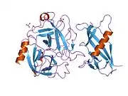 Plasmin is a serine protease that acts to dissolve fibrin blood clots. Apart from fibrinolysis, plasmin proteolyses proteins in various other systems: It activates collagenases, some mediators of the complement system, and weakens the wall of the Graafian follicle, leading to ovulation. Plasmin is also integrally involved in inflammation.[6] It cleaves fibrin, fibronectin, thrombospondin, laminin, and von Willebrand factor. Plasmin, like trypsin, belongs to the family of serine proteases.
