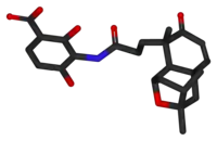 Platensimycin was first isolated from a strain of Streptomyces platensis by workers at Merck.[2][3] Screens of 250,000 natural product extracts (83,000 strains in three growth conditions) led to the identification of a potent and selective small molecule from a strain of Streptomyces platensis recovered from a soil sample collected in South Africa. The identification process was carried out using a two-plate system in which control organisms were compared to cells expressing FabF antisense RNA. This method uses a combination of target-based whole-cell and biochemical assays, allowing compounds to be detected at concentrations that would be too low to detect using whole cell assays. The molecule they identified, platensimycin (C24H27NO7, relative molecular mass 441.47), comprises two distinct structural elements connected by an amide bond. The Merck group showed that platensimycin has potent, broad-spectrum Gram-positive activity in vitro and exhibits no cross-resistance to other key antibiotic-resistant bacteria including Methicillin-resistant Staphylococcus aureus(MRSA), vancomycin-intermediate S. aureus, vancomycin-resistant Enterococci, and linezolid-resistant and macrolide-resistant pathogens.