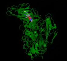 In enteroviruses, Pleconaril prevents the virus from exposing its RNA, and in rhinoviruses Pleconaril prevents the virus from attaching itself to the host cell.[7] Human rhinoviruses (HRVs) contain four structural proteins labeled VP1-VP4. Proteins VP1, VP2 and VP3 are eight stranded anti-parallel β-barrels. VP4 is an extended polypeptide chain on the viral capsid inner surface.[8] Pleconaril binds to a hydrophobic pocket in the VP1 protein. Pleconaril has been shown in viral assembly to associate with viral particles.[9] Through noncovalent, hydrophobic interactions compounds can bind to the hydrophobic pocket. Amino acids in positions Tyr152 and Val191 are a part of the VP1 drug binding pocket.[8]