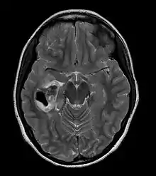 | CT scan of a brain with pleomorphic xanthoastrocytoma. The classic radiographic appearance is one of a superficially situated tumor, here a mural nodule, associated with an underlying cyst. |