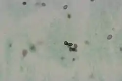 Cyst form of Pneumocystis. GMS Stain. Close apposition of cysts may simulate budding.