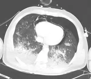 | CT scan showing pneumopericardium with pneumomediastinum, pneumothorax, hemothorax, and pulmonary contusion after severe chest trauma[1] | |