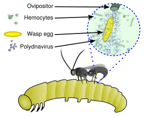Parasitoid wasps serve as hosts for the virus, and Lepidoptera serve as hosts for these wasps. The female wasp injects one or more eggs into its host along with a quantity of virus. The virus and wasp are in a mutualistic symbiotic relationship: expression of viral genes prevents the wasp's host's immune system from killing the wasp's injected egg and causes other physiological alterations that ultimately cause the parasitized host to die. Transmission routes are parental.[1]
