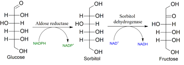The polyol pathway is a two-step process that converts glucose to fructose.[1] In this pathway glucose is reduced to sorbitol, which is subsequently oxidized to fructose. It is also called the sorbitol-aldose reductase pathway.