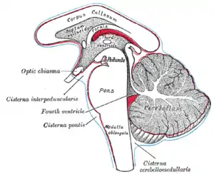 The pontine cistern, also cisterna pontis and cisterna pontocerebellaris is a notable subarachnoid cistern on the ventral aspect of the pons.