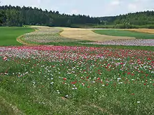 Poppy straw (also known as opium straw, mowed opium straw, crushed poppy capsule, poppy chaff, or poppy husk) is derived from opium poppies (Papaver somniferum) that are harvested when fully mature and dried by mechanical means, minus the ripe poppy seeds. Opium poppy straw today can be one of several different things. It is what remains after the poppy seed harvest, that is, the dried stalks, stem and leaves of poppies grown for their seeds. The dried leaves and stalks are harvested after the seed pods have been used for traditional opium extraction. The field dried leaves, stalk and seed pod are used in commercial manufacture of morphine or other poppy alkaloid derived drugs, by first processing the material to make poppy straw separating the seeds then making concentrate of poppy straw,[1] where no extraction using traditional methods of latex extraction has been made.[2] The straw was originally considered an agricultural by-product of the mechanised poppy seed harvest, which was primarily grown for its edible and oil-producing seed. This changed in 1927 when János Kabay developed a chemical process to extract morphine from the crushed capsule.[1] Concentrated poppy straw consisting mainly of the crushed capsule without the seeds[3] soon became a valuable source of morphine. Today, concentrate of poppy straw is a major source of many opiates and other alkaloids. It is the source of 90% of the world supply of legal morphine (for medical and scientific use)[4] and in some countries it also is a source of illegal morphine, which could be processed into illegal heroin.[3]