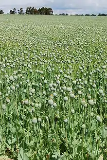 As of 1950, the average annual yield per hectare was estimated to be 675 kilograms (1,488 lb) poppy seed and 450 kilograms (990 lb) poppy straw (dry capsule chaff), which in turn was estimated to yield about 1.5 kilograms (3.3 lb) of morphine (in good years).[9]