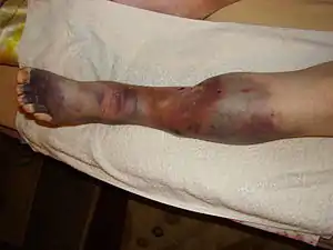 Despite ongoing research, the cause of PTS is not entirely clear. Inflammation is thought to play a role[5][6] as well as damage to the venous valves from the thrombus itself. This valvular incompetence combined with persistent venous obstruction from thrombus increases the pressure in veins and capillaries. Venous hypertension induces a rupture of small superficial veins, subcutaneous hemorrhage[7] and an increase of tissue permeability. That is manifested by pain, swelling, discoloration, and even ulceration.[8]
