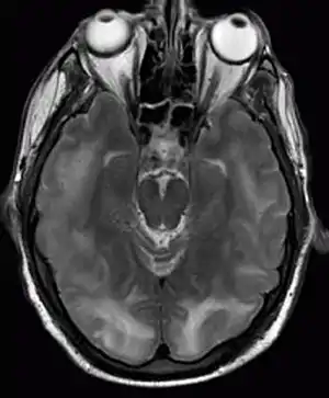 | Posterior reversible encephalopathy syndrome visible on magnetic resonance imaging as multiple cortico-subcortical areas of T2-weighted hyperintense (white) signal involving the occipital and parietal lobes bilaterally and pons. | |