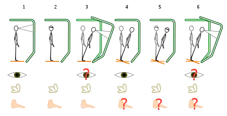 | Conclusions | Inability to make effective use of vestibular information | Inability to suppress the influence of inaccurate visual information ("visual preference") | Inability to make effective use of vestibular information AND to suppress the influence of inaccurate visual information | No effective use of either visual or vestibular information (dependence on somatosensory input for balance) | No effective use of either visual or vestibular information AND vision dependence | Dependence on visual and somatosensory inputs | |||