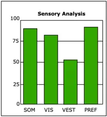 SOT results are subdivided in an Equilibrium Score, a Sensory Analysis, a Strategy Analysis and COG Alignment. The sensory analysis calculates 4 different scores: somatosensory (SOM), visual (VIS), vestibular (VEST) and visual preference (PREF) (otherwise known as "visual dependence",[9][10] an excessive reliance on visual information even when it is inappropriate). The scores are respectively calculated as ratios of the 6 different scores of the equilibrium score:[11]
