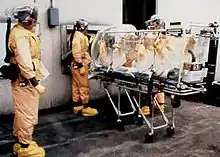 In healthcare, a product known as the Racal suit can be used, consisting of a plastic suit and a PAPR fitted with HEPA filters. They were used by the U.S. Army Aeromedical Isolation Team to perform medical evacuations of patients with highly infectious diseases.[11][12]