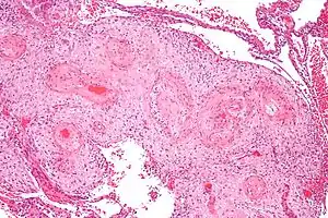 Micrograph showing hypertrophic decidual vasculopathy, the histomorphologic correlate of gestational hypertension. H&E stain.