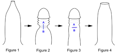 Preputioplasty may be performed by Z-plasty, also used in reconstructive surgery to loosen constricting scar tissue following traumatic burns.
