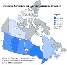 A survey of Canadian maternity practices conducted in 2006/2007, and published in 2009 by the national public health agency, found a newborn circumcision rate of 31.9%.[18] Rates varied markedly across the country, from close to zero in Newfoundland and Labrador to 44.3% in Alberta. In 2015, the Canadian Paediatric Society used those statistics in determining the national circumcision rate it currently quotes.[18][23]