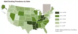 There are large regional differences in smoking rates, with Kentucky, West Virginia, Oklahoma and Mississippi topping the list, and Idaho, California and Utah at significantly lower rates.[53]