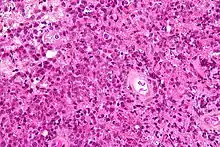 A primary central nervous system lymphoma (PCNSL), also termed primary diffuse large B-cell lymphoma of the central nervous system,[2] is a primary intracranial tumor appearing mostly in patients with severe immunodeficiency (typically patients with AIDS). It is a subtype and one of the most aggressive of the diffuse large B-cell lymphomas.[3] PCNSLs represent around 20% of all cases of lymphomas in HIV infections. (Other types are Burkitt's lymphomas and immunoblastic lymphomas). Primary CNS lymphoma is highly associated with Epstein-Barr virus (EBV) infection (> 90%) in immunodeficient patients (such as those with AIDS and those immunosuppressed),[4] and does not have a predilection for any particular age group. Mean CD4+ count at time of diagnosis is ~50/uL. In immunocompromised patients, prognosis is usually poor. In immunocompetent patients (that is, patients who do not have AIDS or some other immunodeficiency), there is rarely an association with EBV infection or other DNA viruses. In the immunocompetent population, PCNSLs typically appear in older patients in their 50s and 60s. Importantly, the incidence of PCNSL in the immunocompetent population has been reported to have increased more than 10-fold from 2.5 cases to 30 cases per 10 million population.[5][6] The cause for the increase in incidence of this disease in the immunocompetent population is unknown.