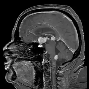 | Brain magnetic resonance imaging showing primary central nervous system B-cell non-Hodgkin lymphoma of the sella turcica and hypothalamus, continuing to the tectum (intensely white areas in the middle). | |