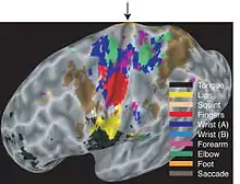 First, the arm representation may be organized in a core and surround manner. In the monkey cortex, the digits of the hand are represented in a core area at the posterior edge of the primary motor cortex. This core area is surrounded on three sides (on the dorsal, anterior, and ventral sides) by a representation of the more proximal parts of the arm including the elbow and shoulder.[7][8] In humans, the digit representation is surrounded dorsally, anteriorly, and ventrally, by a representation of the wrist.[9]