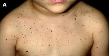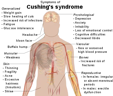 PPNAD is a rare cause of high cortisol levels in the blood and often manifests as ACTH-independent Cushing's syndrome.[2][3] The effects of PPNAD can often be cyclical so the symptoms of Cushing's syndrome will not always be as severe, which may complicate diagnosis.[4] The classic symptoms of Cushing's syndrome include rapid central weight gain, a puffy red face and a buffalo hump at the back of the neck due to fat deposits. Skin changes in Cushing's syndrome include thinning and bruising easily, developing striae and hyperpigmentation at skin folds. The hormonal changes can lead to hirsutism, males developing breast tissue, females no longer having periods and both sexes may become infertile. High cortisol levels can lead to psychological disturbances such as anxiety or depression and insomnia. Bone health can deteriorate, leading to an increased fracture risk in people with Cushing's syndrome.[5] PPNAD is unique as it often causes Cushing's at a young age, in children and adolescents.[3] In addition to the other symptoms of Cushing's syndrome, the patient may have a short stature due to interrupted growth because of ACTH suppression.[5]