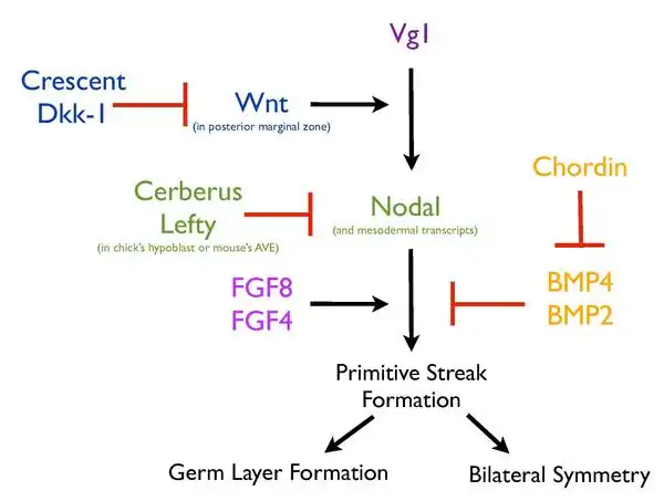 The formation of the primitive streak relies on a complex network of signaling pathways that work together to ensure that this process is highly regulated. Activation of various secreted factors (Vg1, Nodal, Wnt8C, FGF8 and Chordin) and transcription factors (Brachyury and Goosecoid) adjacent to the site of streak formation is required for this process.[9][10][11][12][13] In addition, structures such as the hypoblast also play an important role in the regulation of streak formation. Removal of the hypoblast in the chick results in correctly patterned ectopic streaks, suggesting that the hypoblast serves to inhibit formation of the primitive streak.[13]