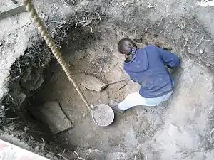 Privies can be constructed of stone, brick, or wood and vary considerably from place to place.[4] Some privy vaults are less than 2 feet deep and others are more than 25 feet. They can be as narrow as 2 feet or as wide as 10 feet, particularly in urban settings where a large privy shed with multiple doors and inner compartments once stood. Some vaults are cylindrical, these are usually made of stone or brick. Though there are cylindrical privies that are actual wooden barrels placed in the ground. Others are rectangular and commonly made of stone, brick, or wood. Many shallower rectangular vaults were only wood-lined.