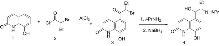 8-Hydroxycarbostyril 1 is acylated with 2-bromobutyric acid chloride 2 at the fifth position of the quinoline system, which gives the compound 3. This undergoes action of isopropylamine, forming an aminoketone, the carbonyl group of which is reduced by sodium borohydride, giving procaterol 4.