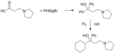Procyclidine, 1-cyclohexyl-1-phenyl-3-pyrrolidinopropan-1-ol, is synthesized in exactly the same manner as was seen for trihexyphenidyl, except this time the linear synthesis begins with the preparation of 3-(1-pyrrolidino)propiophenone.