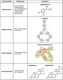 | 1 | Peptide | Peptide hormones are made of a chain of amino acids that can range from just 3 to hundreds of amino acids. Examples include oxytocin and insulin.[9] Their sequences are encoded in DNA and can be modified by alternative splicing and/or post-translational modification.[15] They are packed in vesicles and are hydrophilic, meaning that they are soluble in water. Due to their hydrophilicity, they can only bind to receptors on the membrane, as travelling through the membrane is unlikely. However, some hormones can bind to intracellular receptors through an intracrine mechanism. |