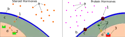 Hormones affect distant cells by binding to specific receptor proteins in the target cell, resulting in a change in cell function. When a hormone binds to the receptor, it results in the activation of a signal transduction pathway that typically activates gene transcription, resulting in increased expression of target proteins. Hormones can also act in rapid, non-genomic pathways that can be synergistic with genomic effects.[5] Water-soluble hormones (such as peptides and amines) generally act on the surface of target cells via second messengers. Lipid soluble hormones, (such as steroids) generally pass through the plasma membranes of target cells (both cytoplasmic and nuclear) to act within their nuclei. A notable exception to this are brassinosteroids in plants, which despite being lipid soluble, still bind to their receptor at the cell surface.[6]