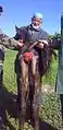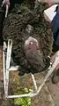 Prolapsed uterus in cattle, particularly dairy cattle, generally occurs in the first 12 hours post-calving. Frequent causes are hypocalcemia combined with irritation of the birth canal, causing straining. Replacement of the protrusion, which can range from the size of a softball to the hanging of the entire uterus down below the hocks, is performed with the cow in sternal recumbency, an epidural injection, and hindlimbs 'frogged' rearwards to allow the pelvis to tip forward, easing replacement. Careful washing and cleaning prior to replacement is important as is ensuring that the horns are completely everted once inside the cow. Often a Buhner suture is placed in the vulva to prevent subsequent reprolapse.
