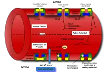 Propofol has been proposed to have several mechanisms of action,[62][63][64] both through potentiation of GABAA receptor activity and therefore acting as a GABAA receptor positive allosteric modulator, thereby slowing the channel-closing time, and at high doses, propofol may be able to activate GABAA receptors in the absence of GABA, behaving as a GABAA receptor agonist as well.[65][66][67] Propofol analogs have been shown to also act as sodium channel blockers.[68][69] Some research has also suggested that the endocannabinoid system may contribute significantly to propofol's anesthetic action and to its unique properties.[70] EEG research upon those undergoing general anesthesia with propofol finds that it causes a prominent reduction in the brain's information integration capacity.[71]