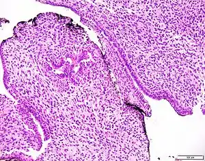 - De Berardinis, E.; Busetto, GM.; Antonini, G.; Giovannone, R.; Di Placido, M.; Magliocca, FM.; Di Silverio, A.; Gentile, V. (2012). "Incidental prostatic stromal tumor of uncertain malignant potential (STUMP): histopathological and immunohistochemical findings". Urologia. 79 (1): 65–8. doi:10.5301/RU.2012.9099. PMID 22388992. S2CID 14922067.